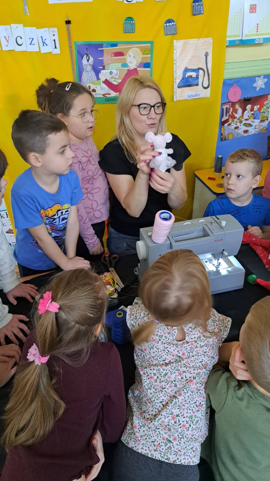 W grupie „Krasnoludków”odbyło się ciekawe spotkanie z krawcową. P. Ania -babcia Leny opowiedziała dzieciom o swoim zawodzie oraz o tym, na czym polega praca krawcowej.
