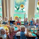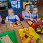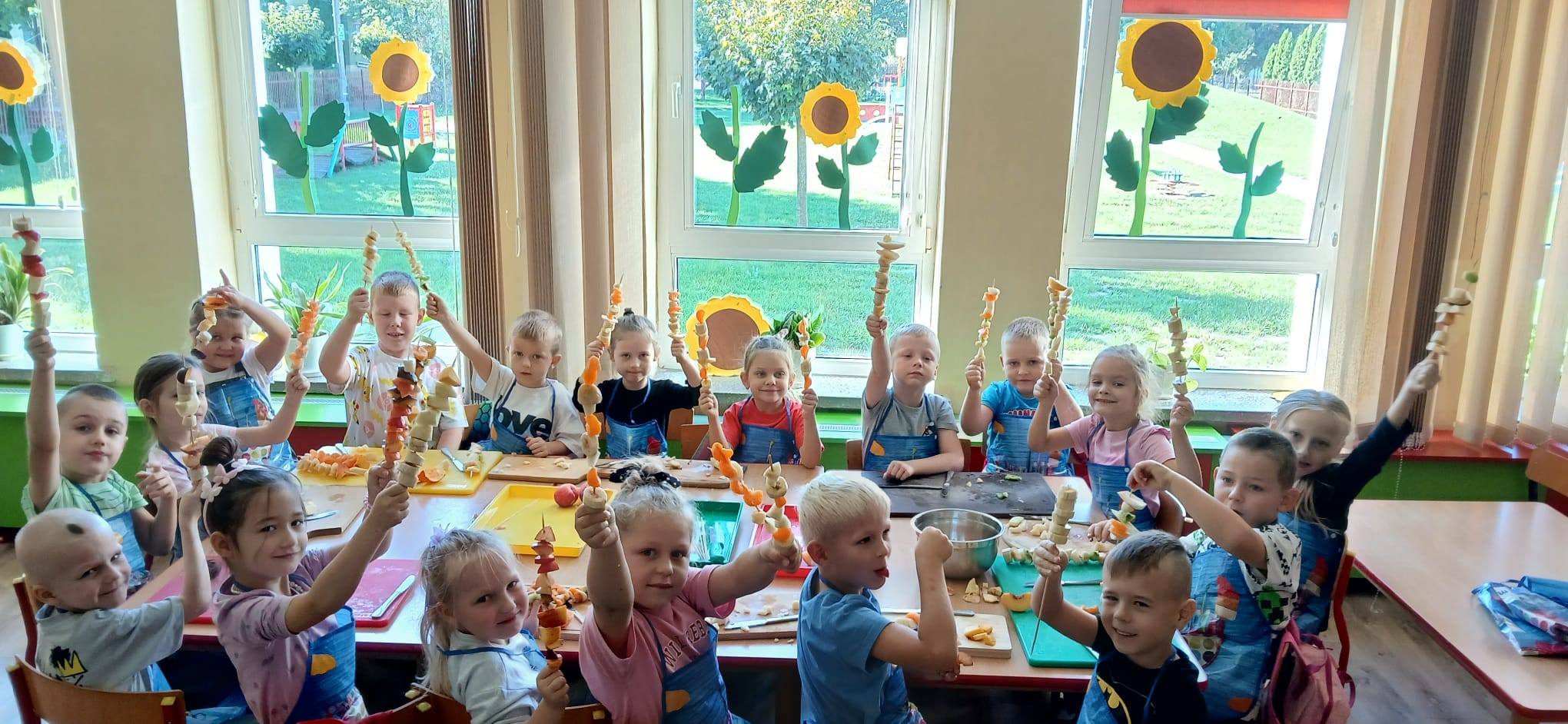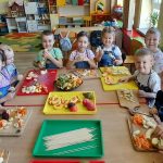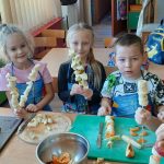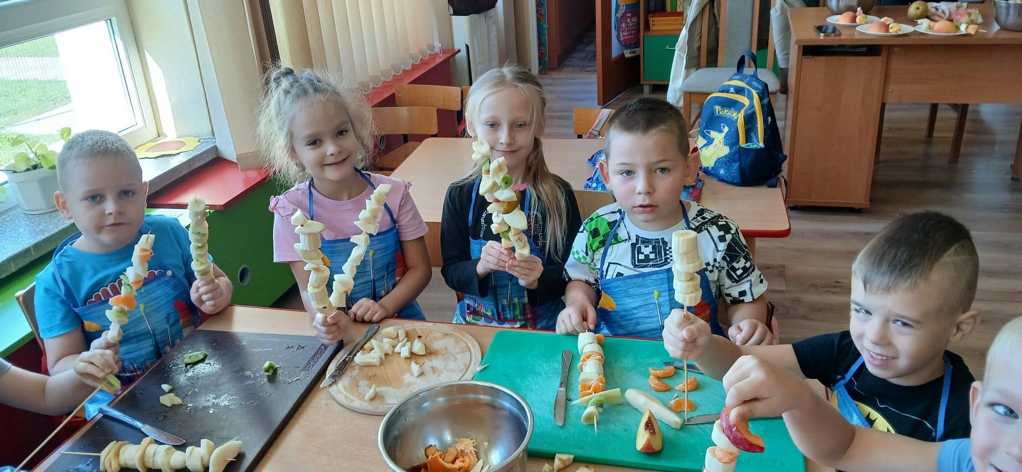 Przygotowania rozpoczęły się od dokładnego umycia rąk oraz owoców, następnie dzieci obierały banany. Uczyły się w ten sposób przygotowania zdrowych przekąsek pełnych witamin. Po skończonej pracy wszystkie dzieci przystąpiły do przygotowania szaszłyków a następnie ze smakiem zajadały owocowe przysmaki. Przedszkolakom bardzo smakowała własnoręcznie wykonana potrawa. Przygotowanie szaszłyków dało dzieciom wiele satysfakcji i radości.