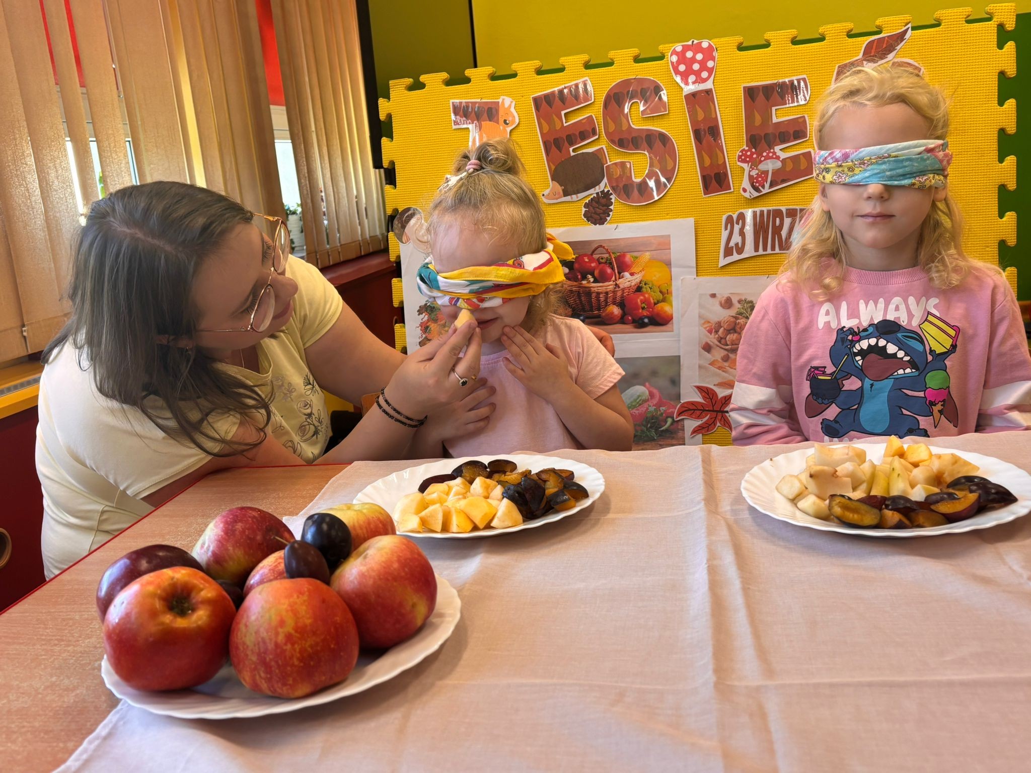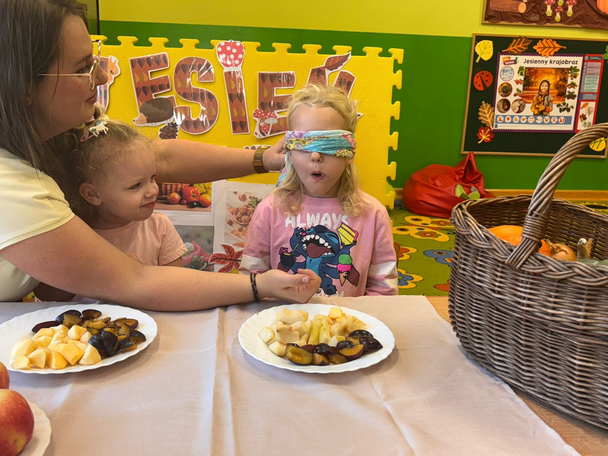 ,, Biedronki” rozpoznawały owocowe smaki jesieni, dzięki zmysłowi węchu i smaku. Dzieci bardzo dobrze sobie poradziły z rozpoznaniem smaku: śliwki, gruszki i jabłka. A zasłonięte oczy nie były przeszkodą, wręcz rozbudził ich kubki smakowe i zmysł węchu.