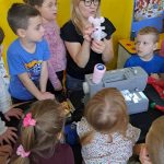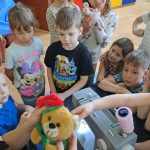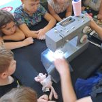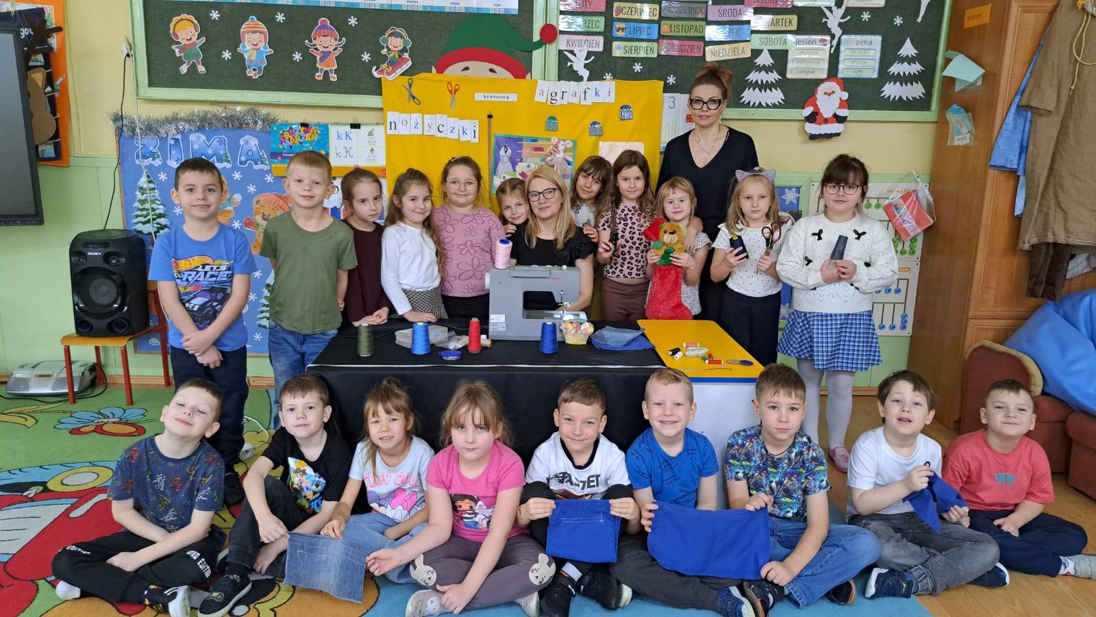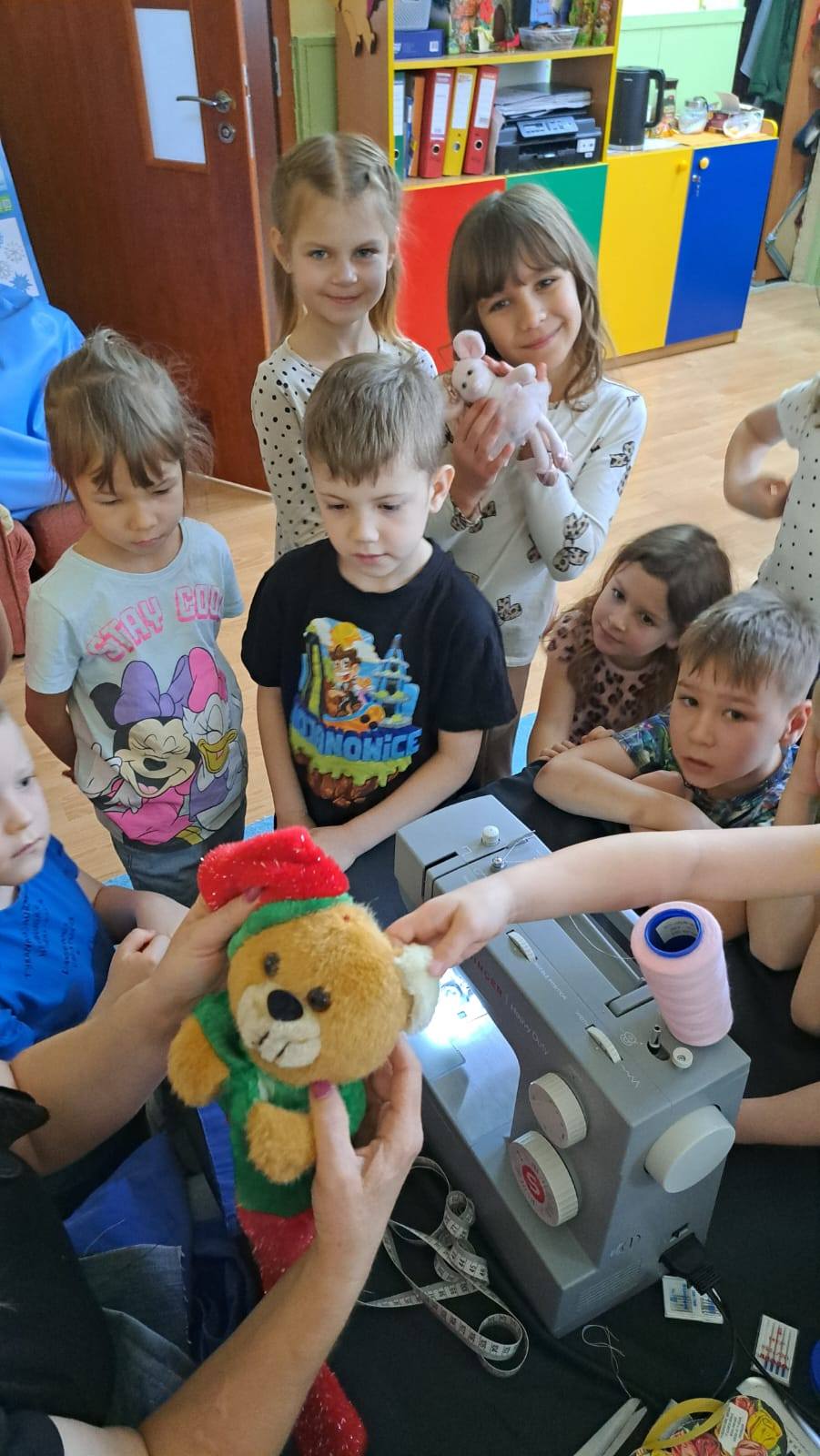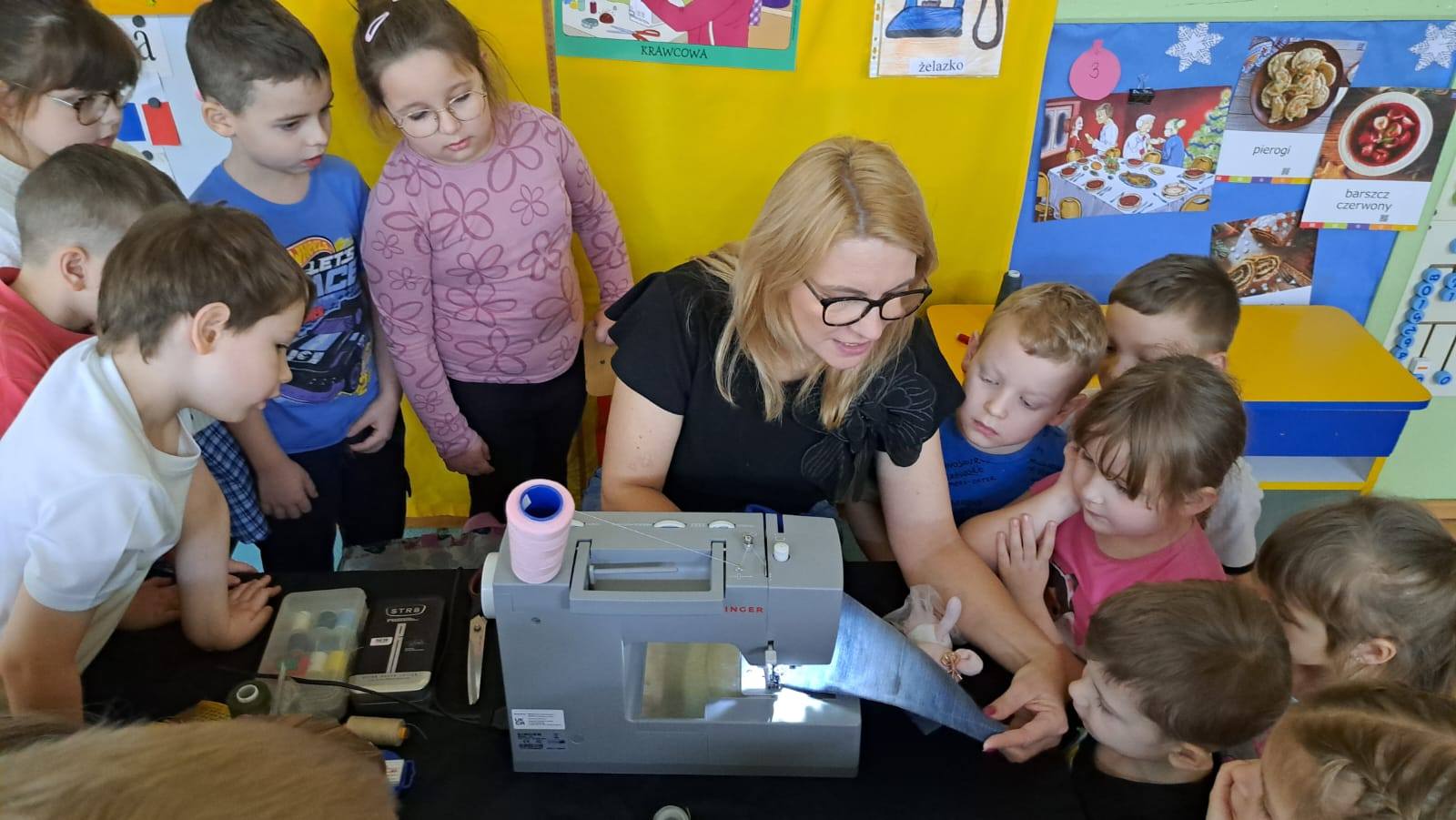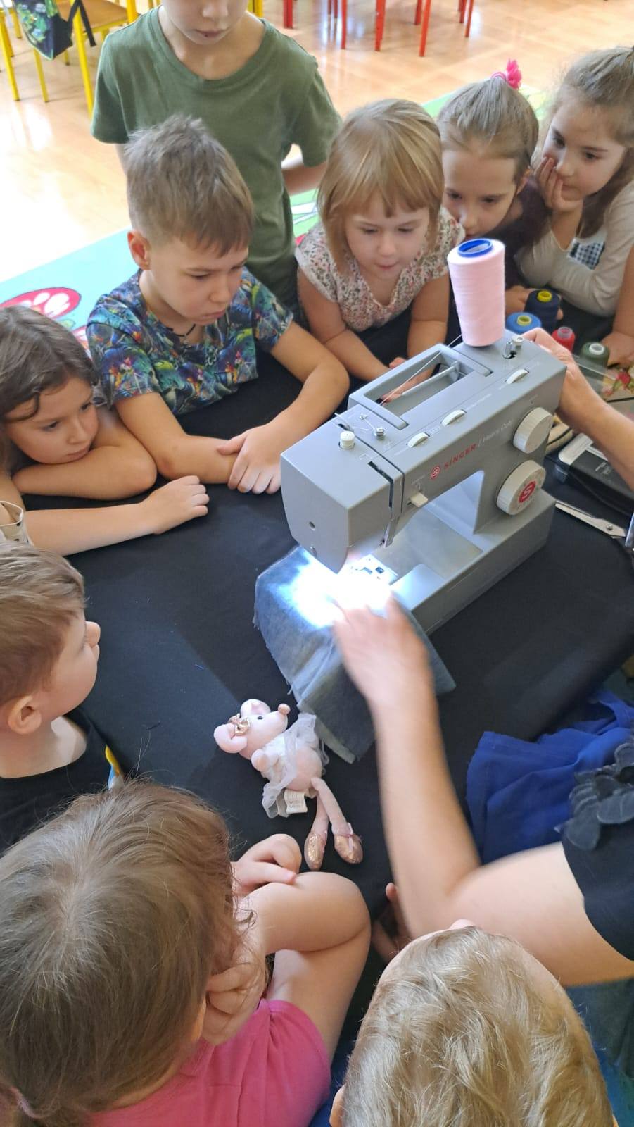 odbyło się ciekawe spotkanie z krawcową. P. Ania -babcia Leny opowiedziała dzieciom o swoim zawodzie oraz o tym, na czym polega praca krawcowej. Sześciolatki miały okazję zobaczyć maszynę do szycia oraz różne przybory krawieckie takie jak: nici, igły, nożyczki, naparstek i materiały. Największą atrakcją bylo wspólne naprawienie ucha pluszowego misia. Spotkanie było bardzo interesujące i pozwoliło dzieciom poznać kolejny zawod oraz rozwijać ciekawość i wyobraźnię.